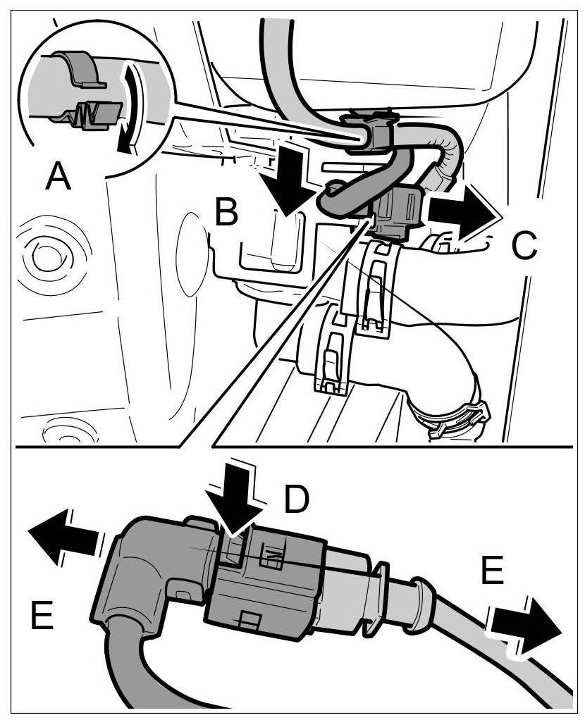 4.3. Release plug connection -arrow D- and disconnect it -arrows E-.