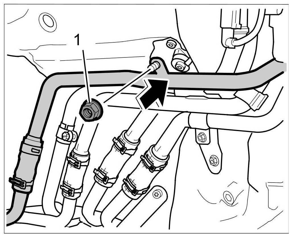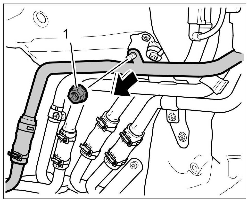 2. Connect the water tube to the threaded bolt -arrow- and secure with the fastening nut -1-. => Tightening torque: 6 Nm (4.5 ftlb.)