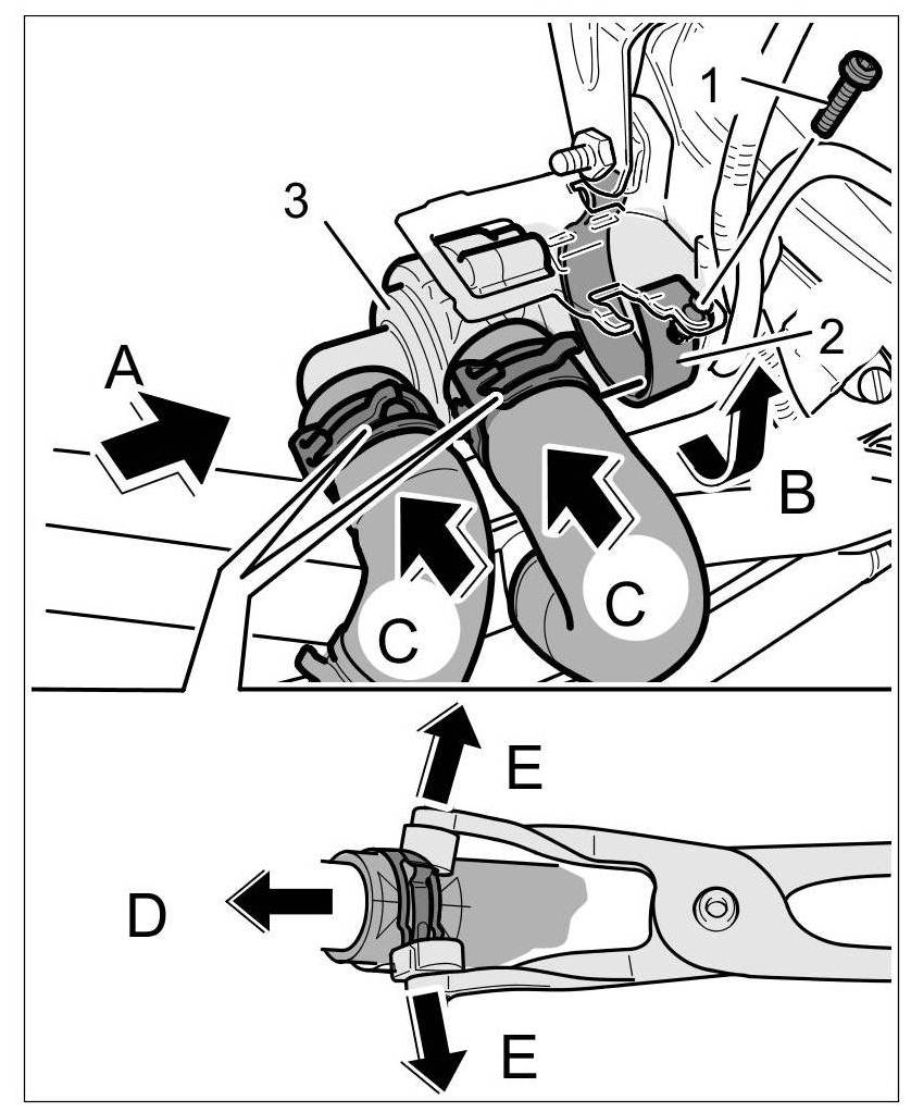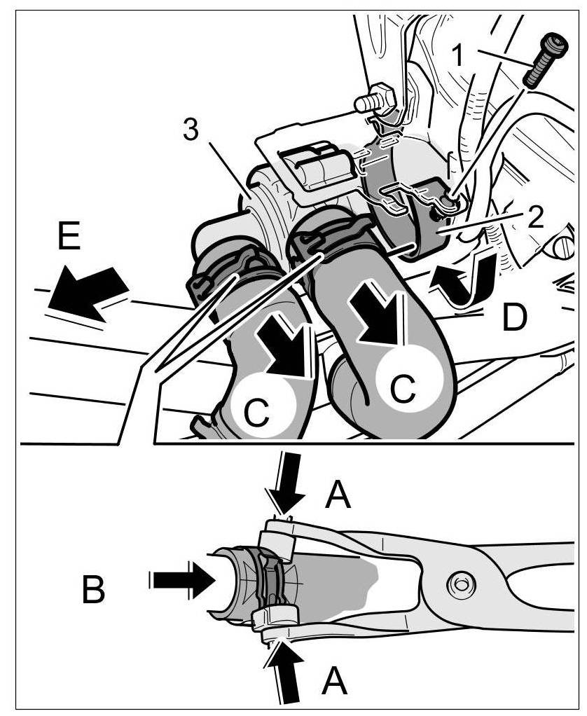 1.5. Slacken spring band clamps -arrows E- and secure the hoses.