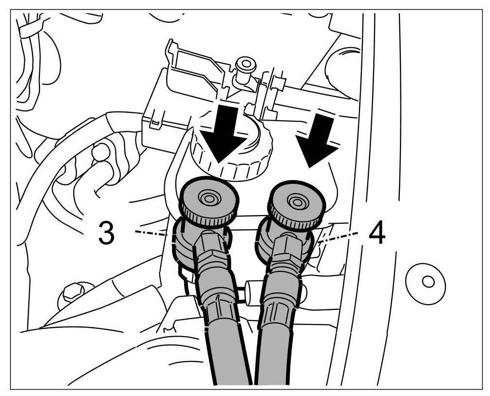 - Before connecting the high-pressure -3- and low-pressure lines -4- to the vehicle, remove any refrigerant remaining in the lines by suction.