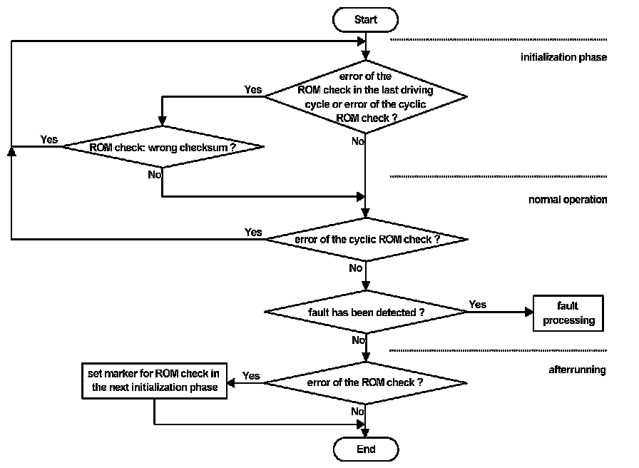 The ROM check is performed once per driving cycle after engine shutdown. In the case of a detected fault (a wrong checksum) the ROM check is repeated in the initialization phase of the following driving cycle. A detected fault in the initialization phase causes a RESET with no function running. Only a no-fault detection in the initialization phase will lead to a normal function and storing of the ROM - fault.