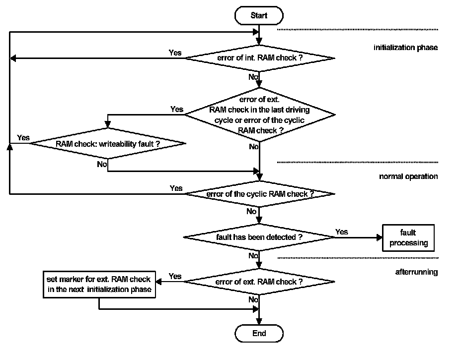 The RAM check is performed once per driving cycle, one part in the initialization phase and the other part in the after running. In case of a detected fault in the after running, this part of the RAM check is repeated in the initialization phase of the following driving cycle. A detected fault in the initialization phase causes a RESET with no function running. Only a no-fault detection in the initialization phase will lead to a normal function and storing the ROM - fault.