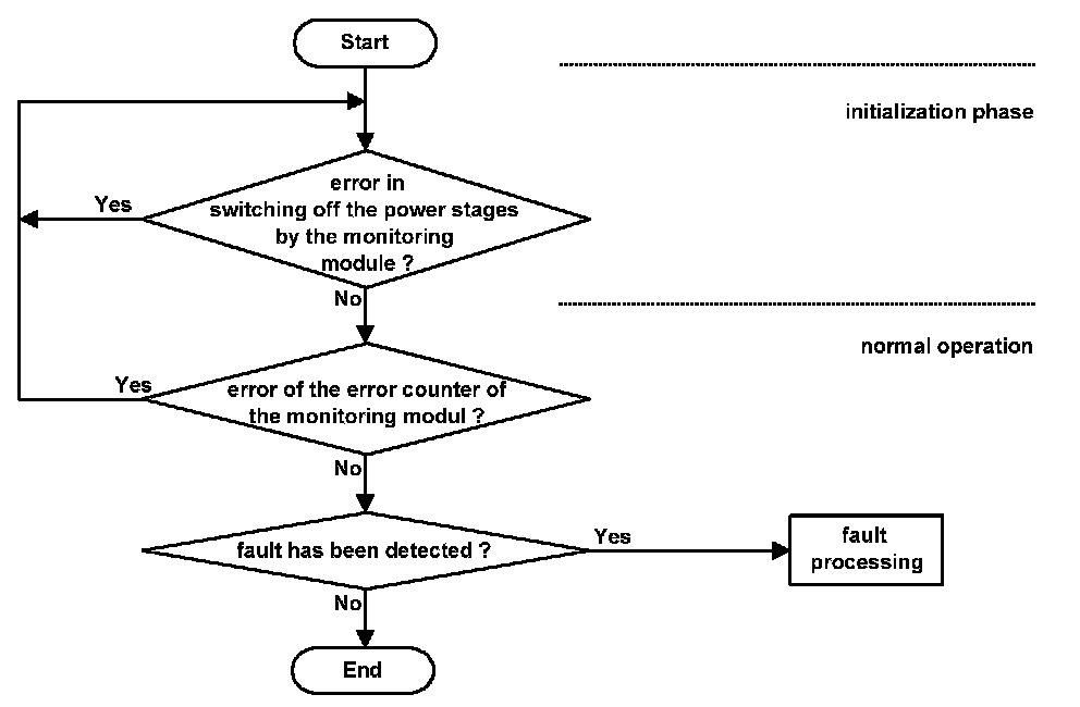 The switching off of the power stages by the monitoring module is checked once per driving cycle in the initialization phase. If the switching off of the power stages by the monitoring module is impossible a RESET is performed with no function running. Only no-fault detection will lead to a normal function and storing the RST - fault.