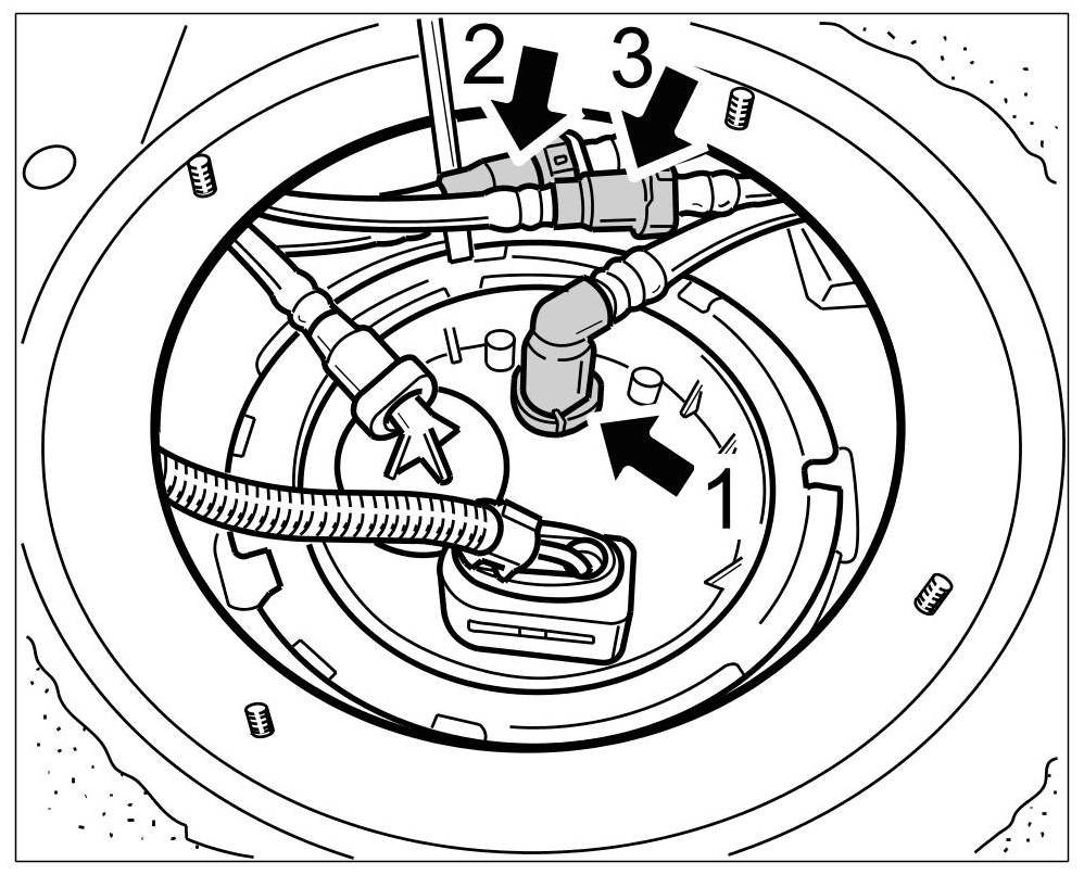 2. Fit all connections (fuel lines, ventilation tubes and electric connectors). => Fuel lines, ventilation tubes and electric connectors