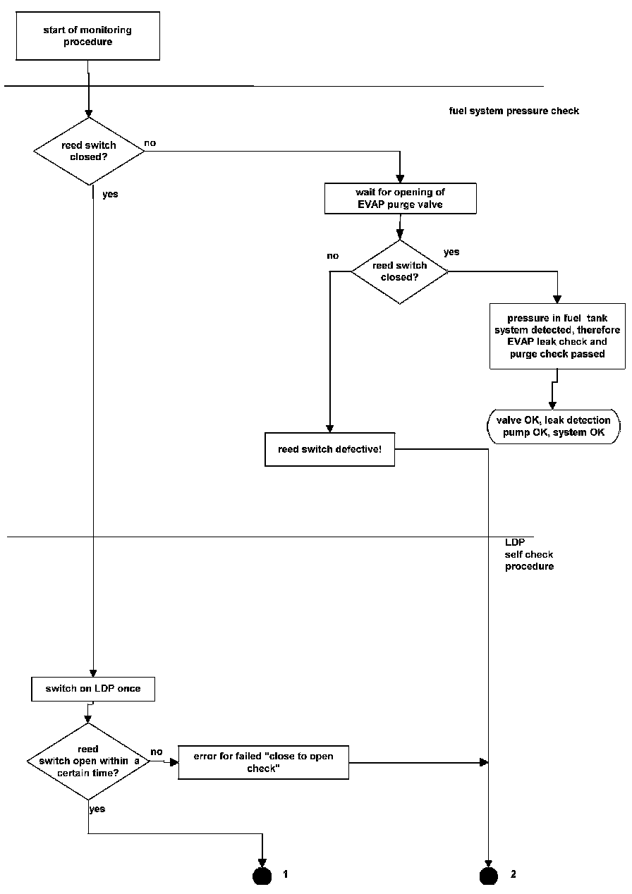 The first step of leakage diagnostics is the pressure check of fuel tank system by testing the reed switch. In case of an open reed switch, the fuel tank system has sufficient pressure for the sealed check and no further pressure has to be supplied to the fuel tank system by the LDP.