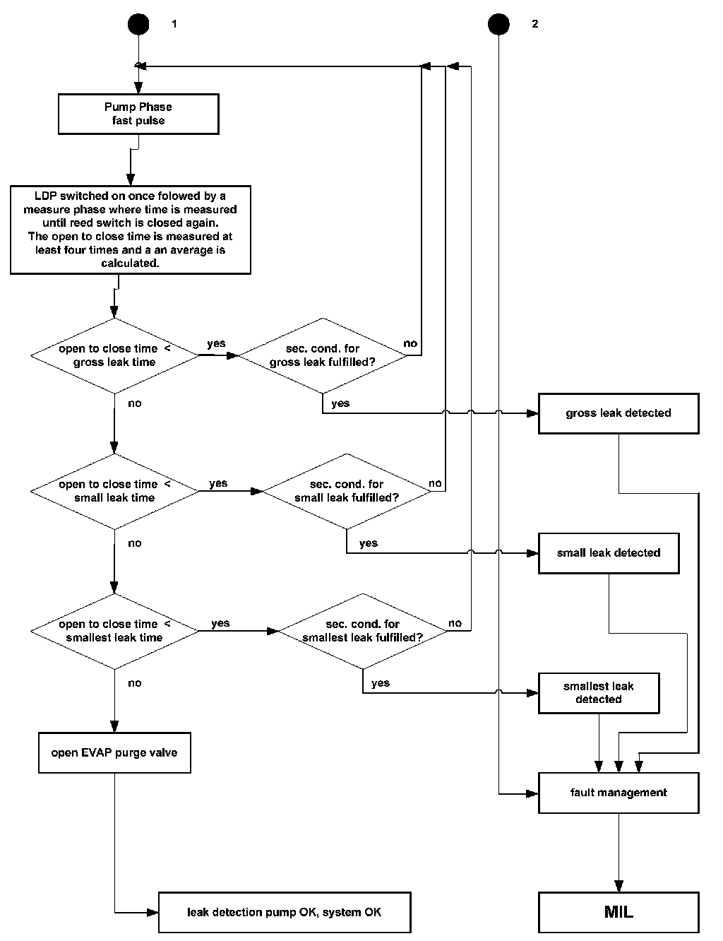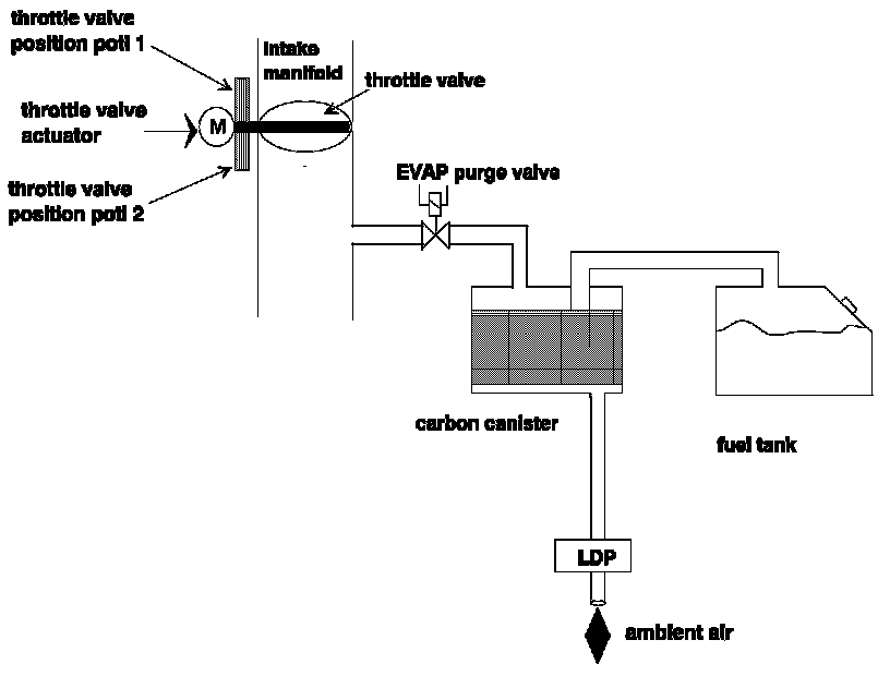 The leakage diagnosis procedure is a pressure check of the EVAP system. In order to perform the check, the EVAP system will be sealed and pressure applied by the leakage diagnosis pump (LDP). The pressure variation time is analyzed by the ECM.