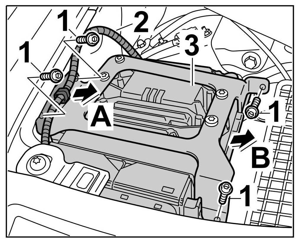 1.3. Move DME control unit and support -3- to one side -arrow B- until the connectors are easily accessible.