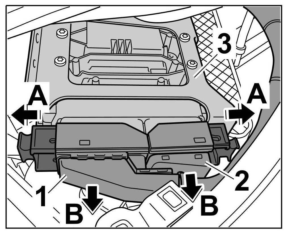 2. Release the latch on both connectors -1 and 2- ( -arrows A- ) and pull the connectors -1 and 2- off the DME control unit -3- ( -arrows B- ).