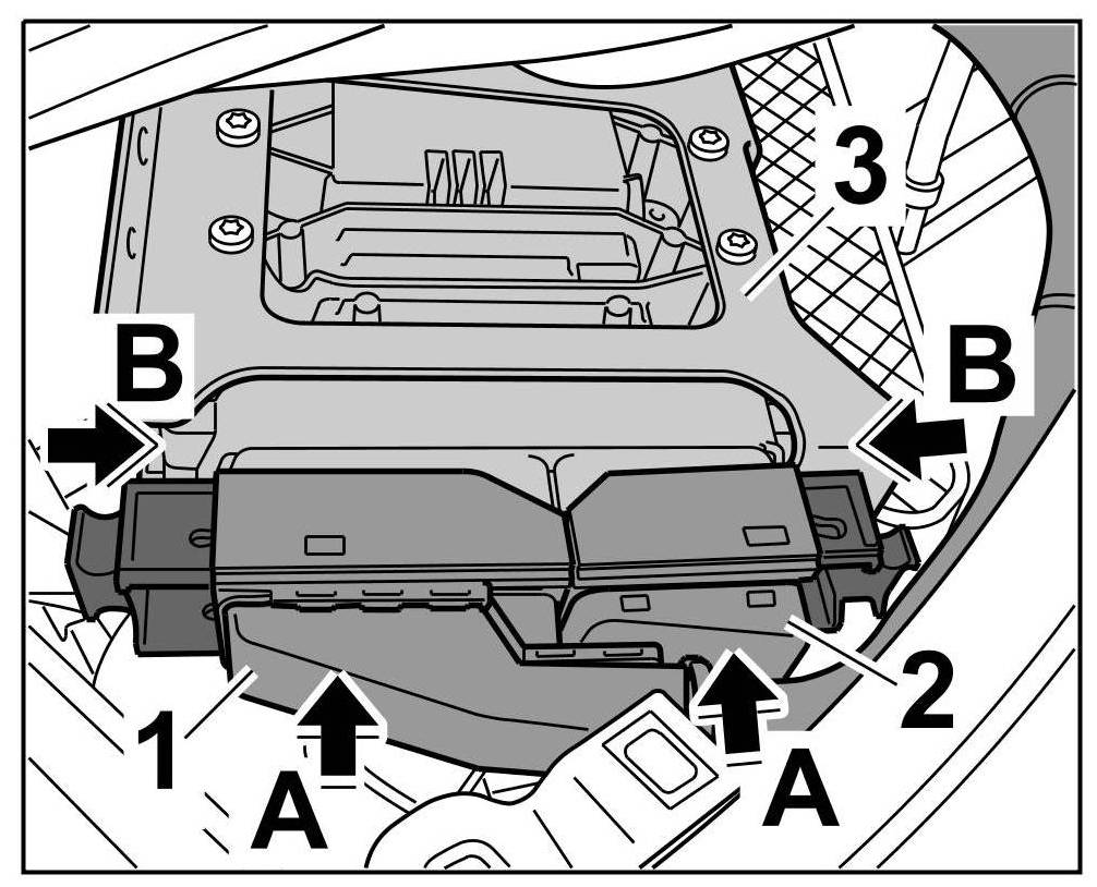 2. Plug in both connectors -1 and 2- on the DME control unit -3- ( -arrows A- ) and close the latch -arrows B-.