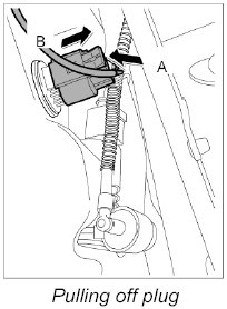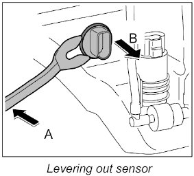 2. Lever sensor out of rubber seal -arrow B-. Collect any emerging fluid with a suitable container.