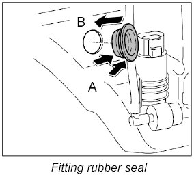 1. Apply a suitable rubber lubricant (tyre mounting paste) to the sealing surface -arrows A- and press rubber seal into tank -arrow B- until it is felt to engage.