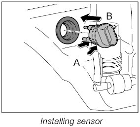 2. Apply a suitable rubber lubricant (tyre mounting paste) to sealing surface -arrows A- and press sensor into rubber seal -arrow B- until it is felt to engage.