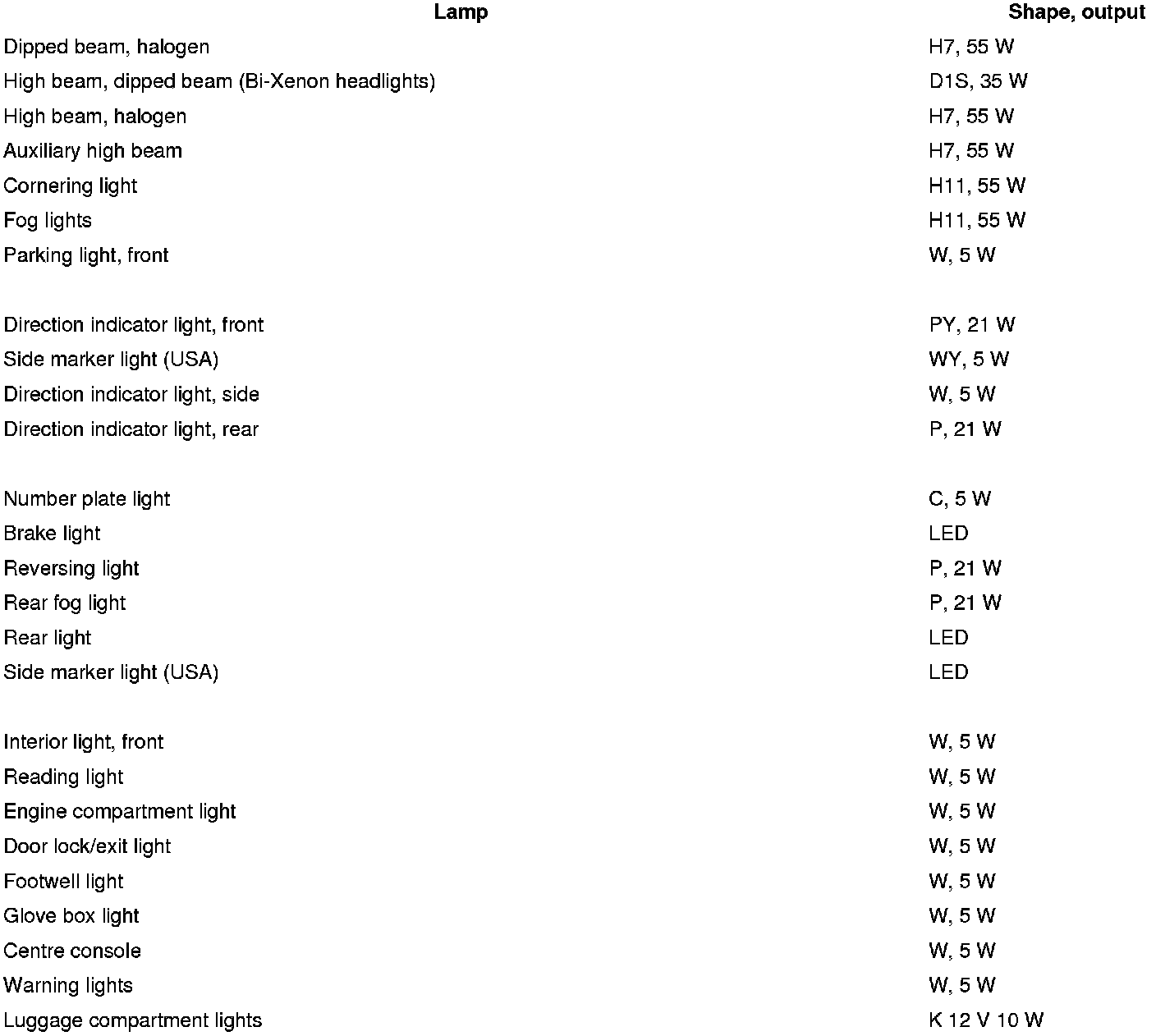 -> Only bulbs specified in the bulb table may be used.
