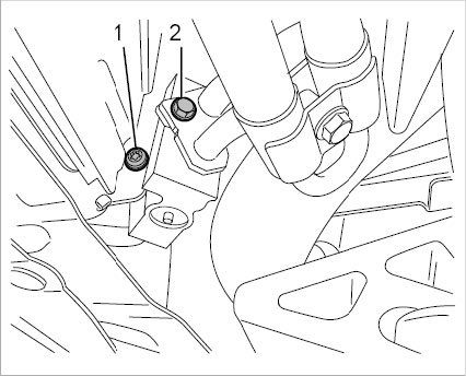 8. Unscrew bolt securing ATF thermostat holder -1- and ATF line to thermostat -2-.