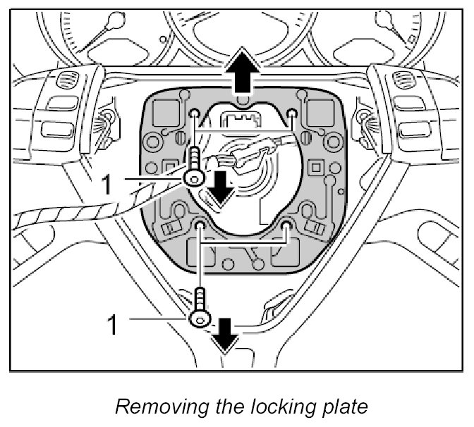1. Unscrew the four fastening screws -1- from the locking plate in the steering wheel and remove along with the locking plate.