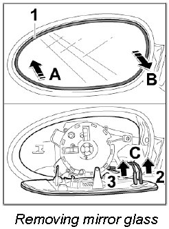 1. Press outside of mirror glass -1- inwards -Arrow A- and pull it out on the inside -Arrow B-.
