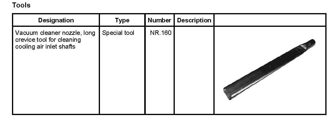 1. Check cooling air guides and radiator for foreign bodies such as leaves. If necessary, carefully clean the cooling air guides and radiator surfaces at the front using a vacuum cleaner with a single nozzle, see Vacuum cleaner nozzle, long crevice tool for cleaning cooling air inlet shafts NR.160. If a high-pressure steam cleaner is used, the steam jets can cause additional particles of dirt to attach to the radiator surface and the cooling vanes can be bent. The engine becomes overheated due to lack of cooling performance.