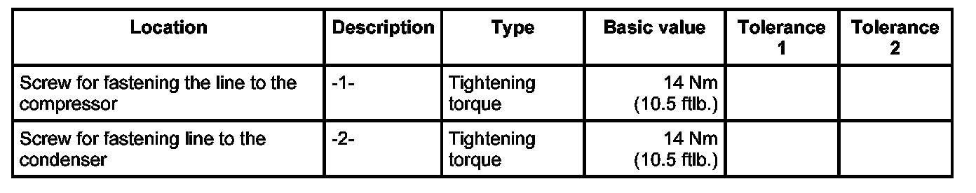 2. Insert compressor-condenser line into the line to the compressor and fasten with the fastening screw -2-. - Tightening torque: 14 Nm (10.5 ftlb.)