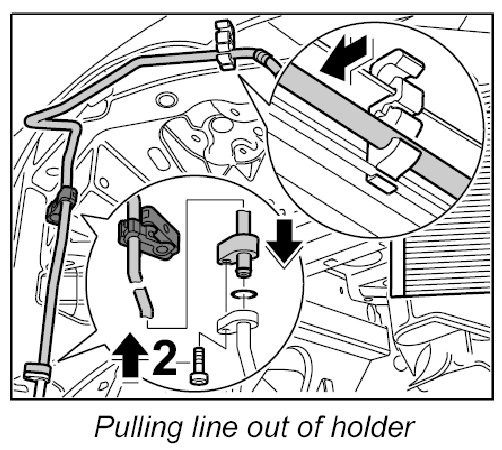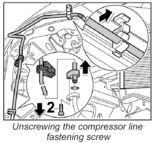 3. Unscrew the fastening screw -2- for the line to the compressor and pull the line out of the compressor line.