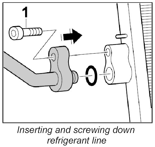 1. Unscrew the fastening screw -1- for the condenser line and pull the line out of the condenser.