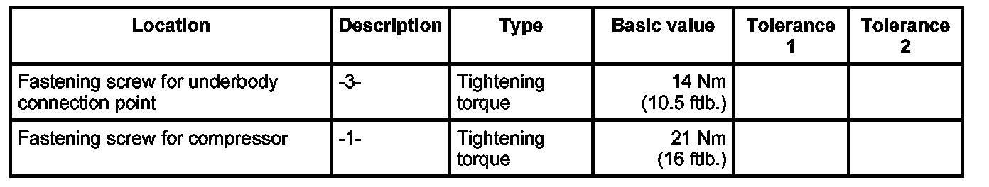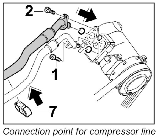 3. Push line into the compressor, secure with the fastening screw -1- and clip line into the support. - Tightening torque: 21 Nm (16 ftlb.)