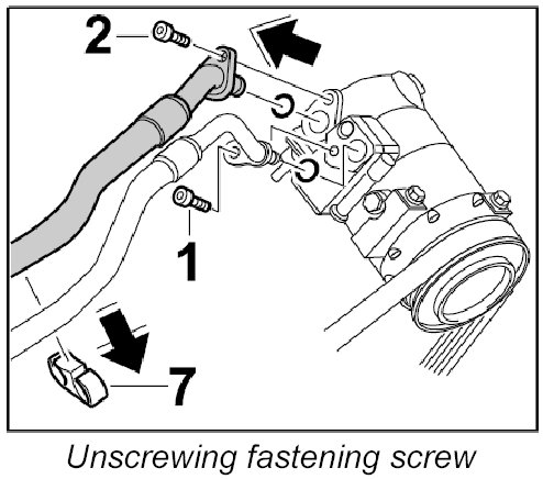 1. Unscrew fastening screw -1- on compressor, pull out line on compressor and remove it from support -7-.