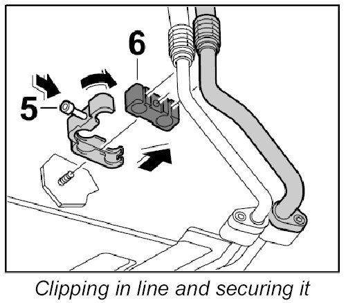 4. Insert line in underbody area into rubber mount -6-, close support and secure with fastening nut -5-.