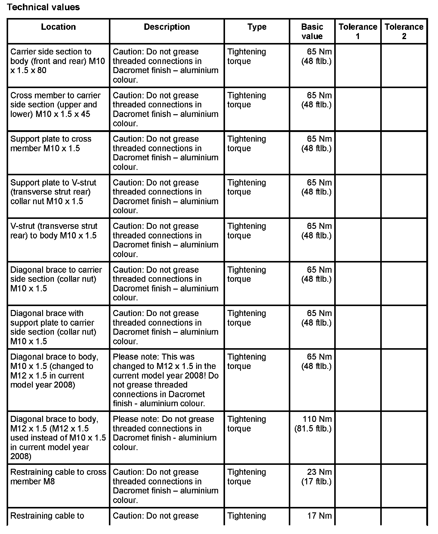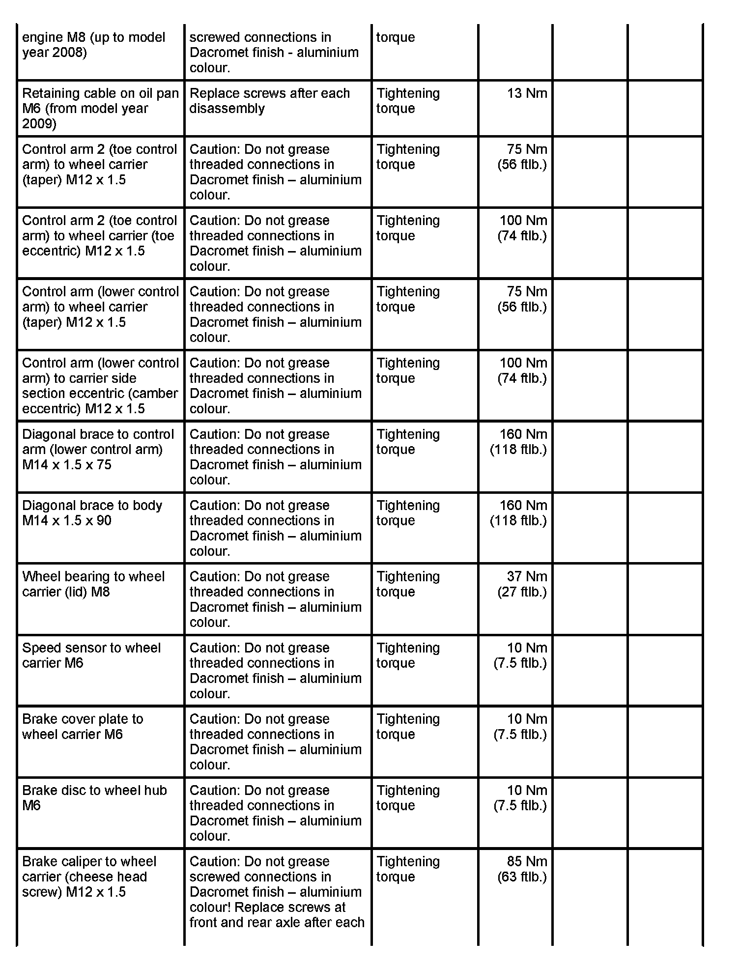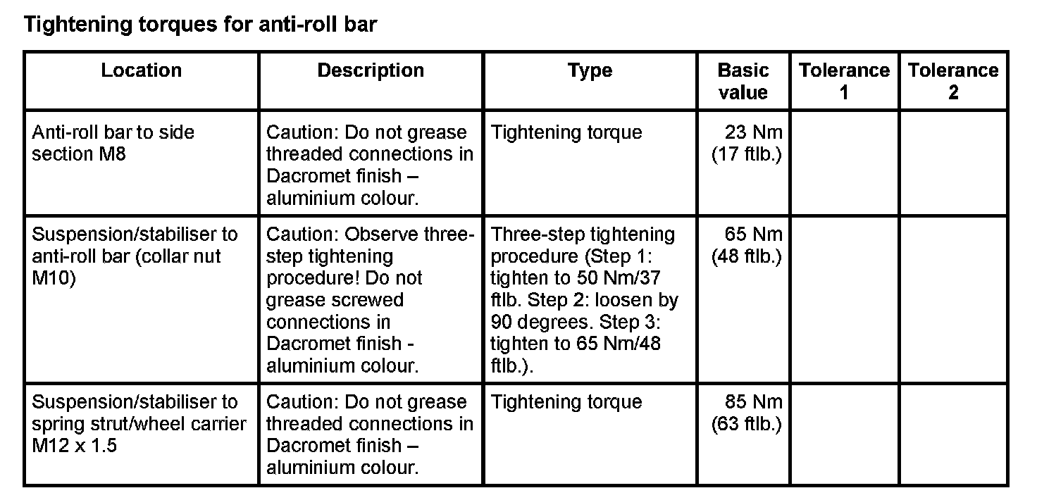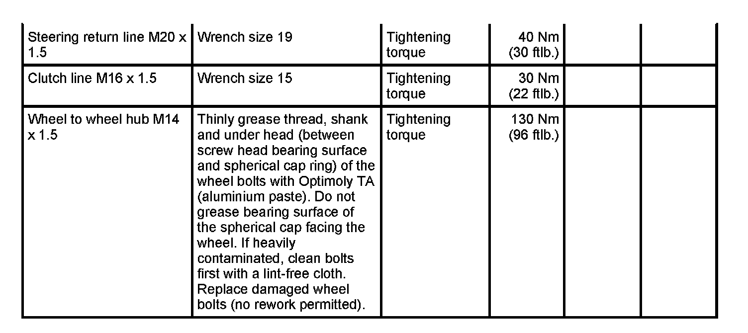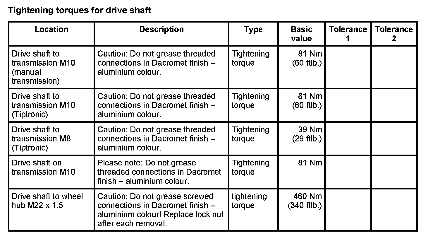 Tightening torques for rear axle