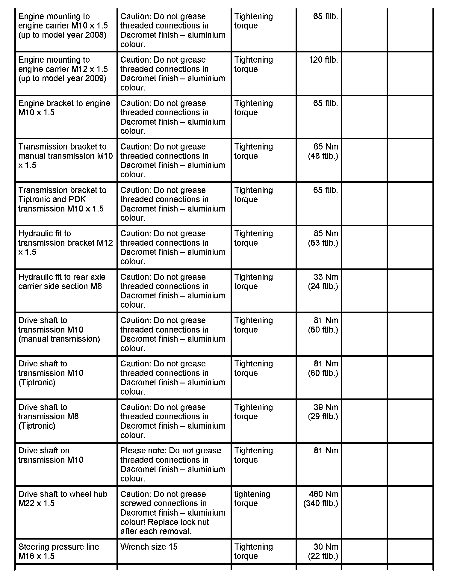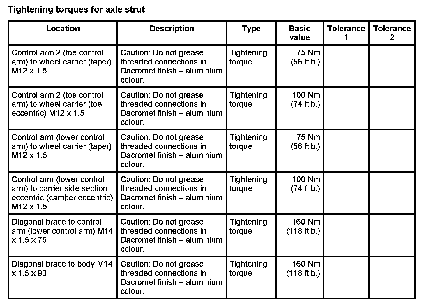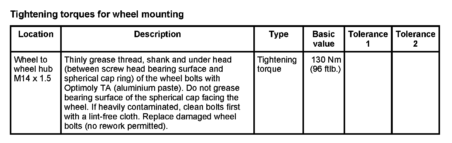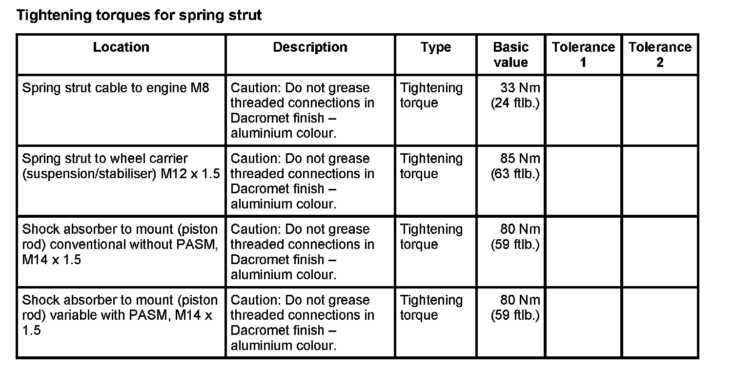 Tightening torques for rear axle