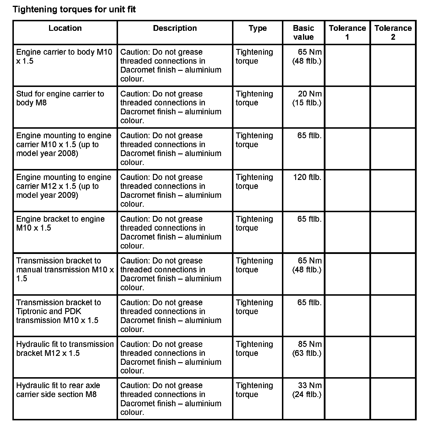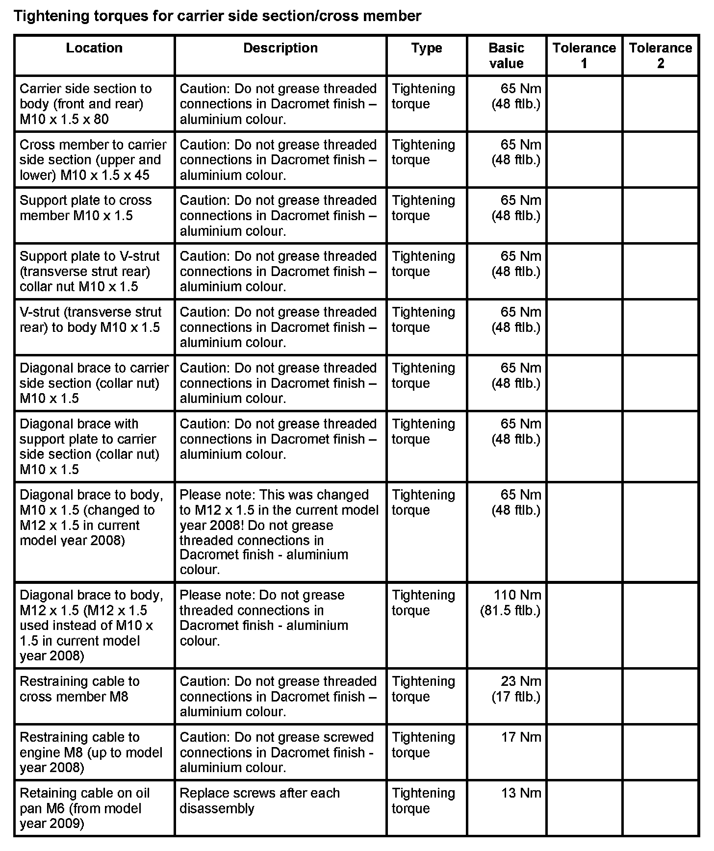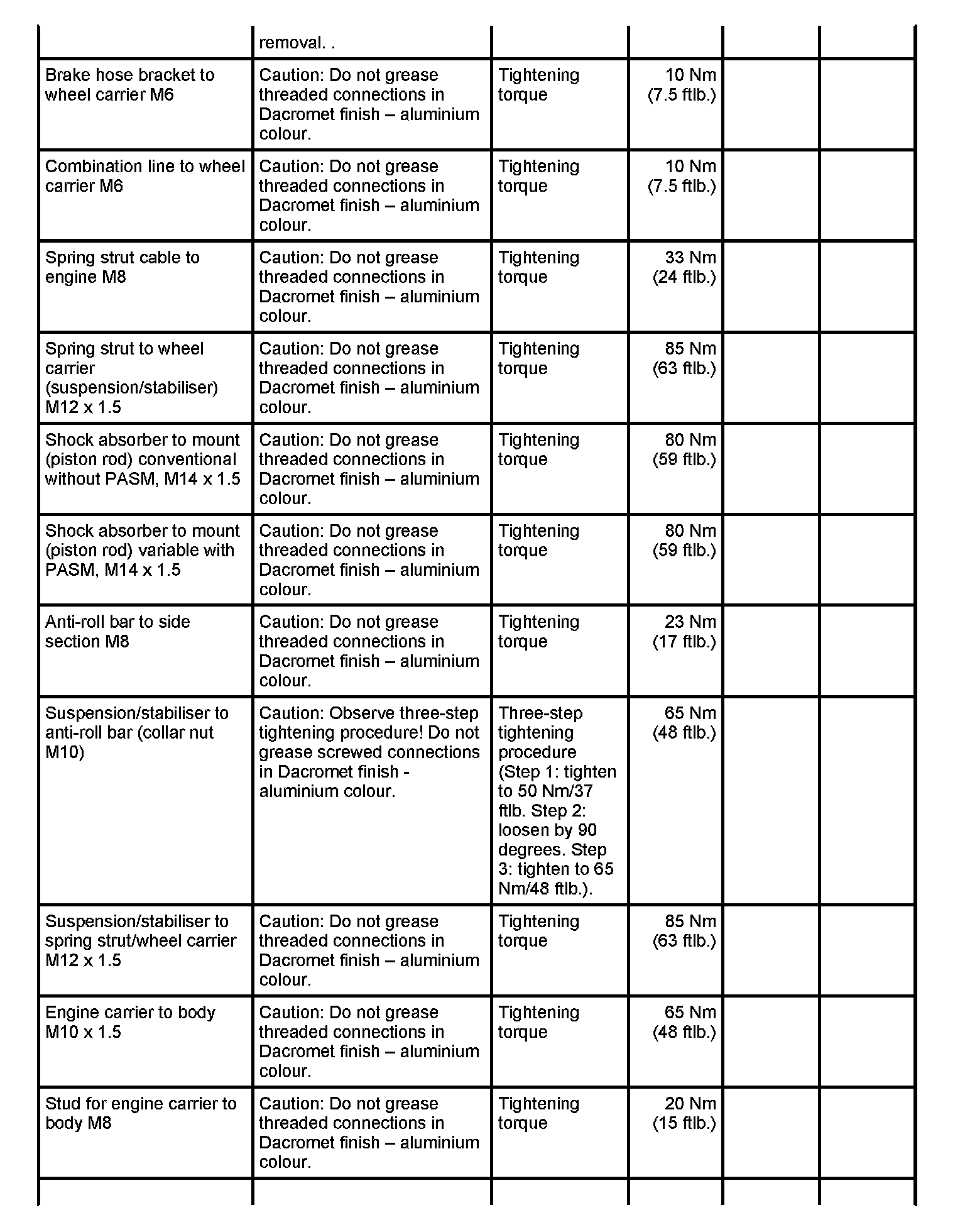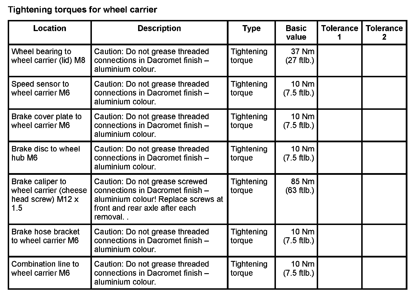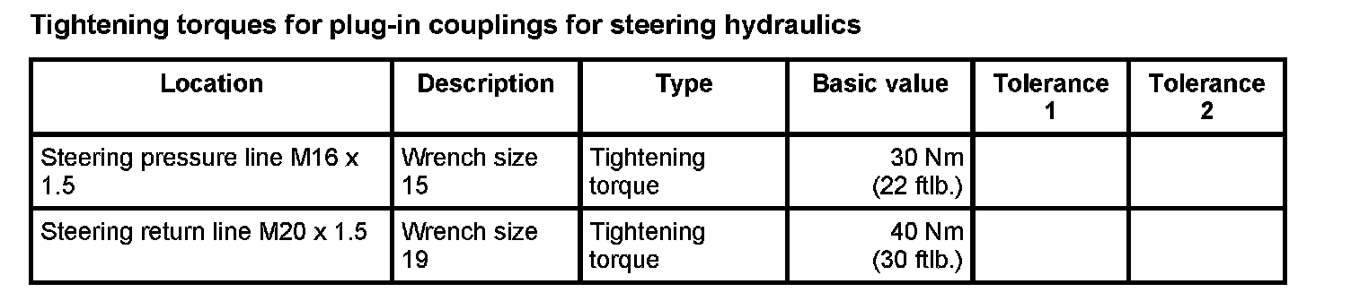 Tightening torques for rear axle