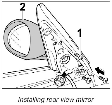 1. Fit rear-view mirror -2- and secure with the fastening screws -1- (-arrow-). Tightening torque: 6 Nm (4.5 ftlb.)