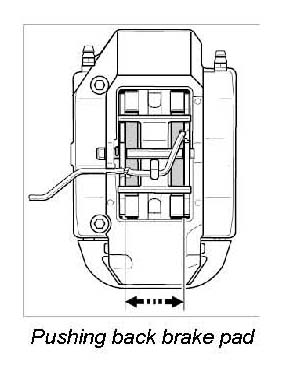 -> The brake pads must be replaced when the brake pad warning indicator lights up, but no later than when there is a residual pad thickness of 2 mm.