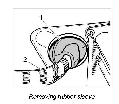 16. Press the rubber sleeve -1- on the luggage compartment rear wall inwards and guide the engine wire harness -2- towards the engine compartment, if the engine is to be lowered later.
