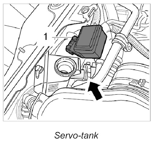 1. Position power-steering reservoir. Lock bayonet lock -arrow- on power-steering reservoir.