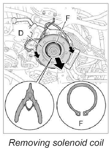 7. Remove Seeger circlip ring -F- for the solenoid coil with the Seeger circlip ring pliers. Remove the magnetic coil from the compressor housing.