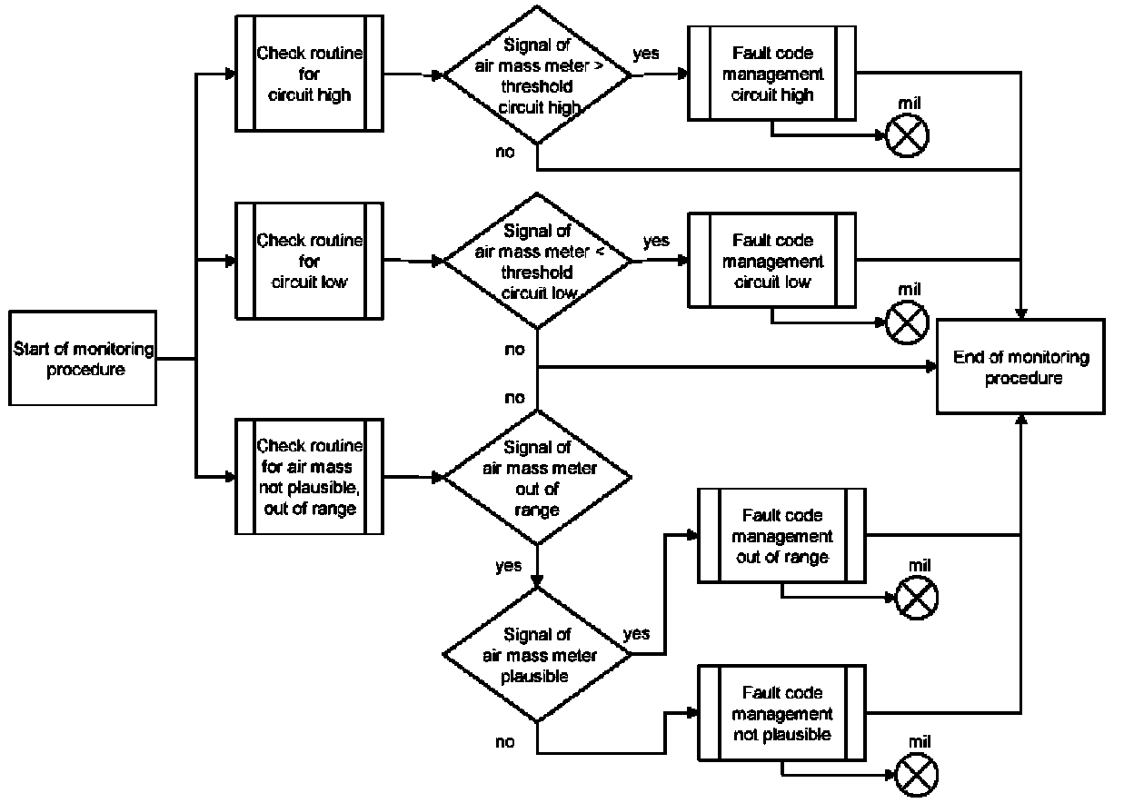 The output voltage of the air mass meter is a measure of air mass. The diagnostic routine compares the mass flow measured by the air mass meter with a calculated mass flow, derived from engine speed an throttle position.