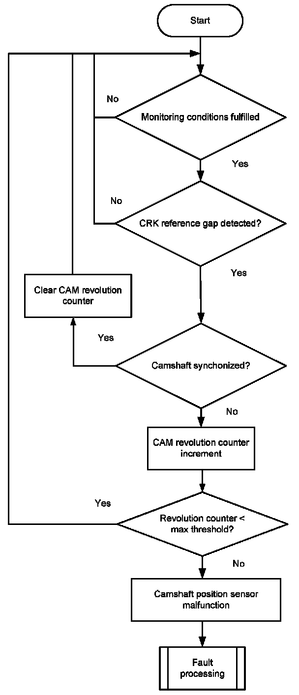 The monitor checks at every reference gap of the crankshaft sensor signal whether the camshaft is synchronized or not. If the camshaft is not synchronized, a revolution counter for the camshaft is incremented. When the counter reaches a threshold the error CAM sync is delivered to the error management.
