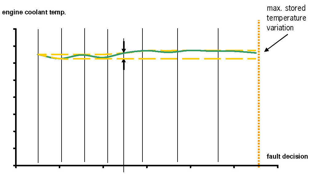 The purpose of this diagnosis is to detect a stuck coolant temperature signal. The diagnostic function checks if after a variation of the calculated coolant temperature also a variation of the measured coolant temperature is detected.