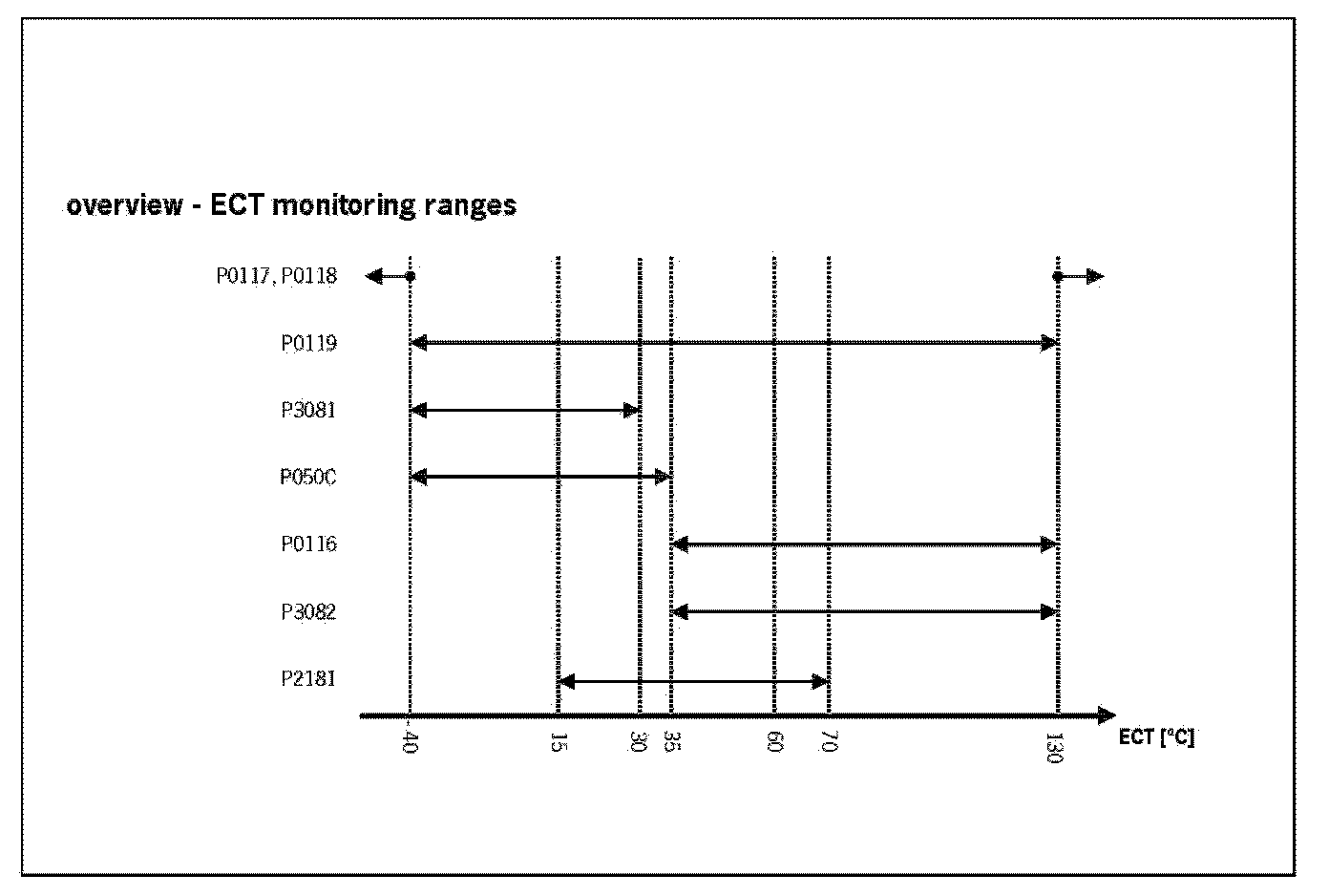 After engine start the system stores continuously the lowest and highest ECT. In case that after several driving conditions the difference between ECT max and ECT min is lower than the threshold the sensor stuck at high values.