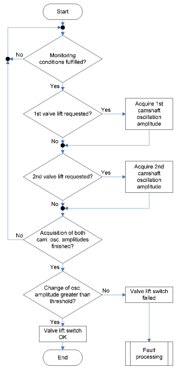 If the change of the camshaft oscillation amplitude before and after the valve lift change request is smaller than a threshold, i.e. no change of the oscillation, then a failure (valve lift change not possible) is detected.