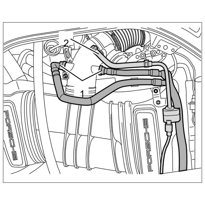 4. Pull off positive crankcase ventilation lines -1- and tank vent line -2- on the intake pipe of the resonance tube.