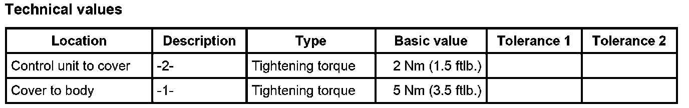 1. Insert control unit into the cover and screw tight with the two fastening screws -2-. Tightening torque: 2 Nm (1.5 ftlb.)