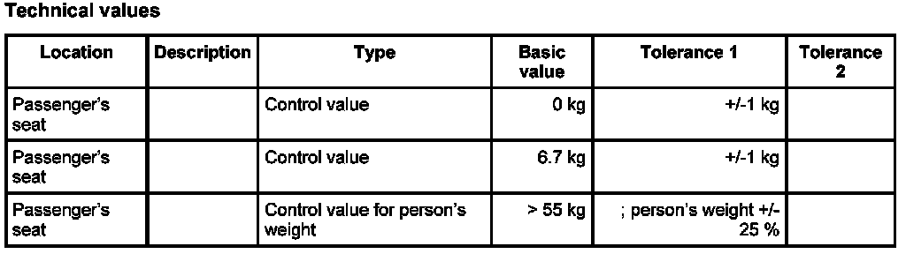 11.1.1. If there is no weight on the passenger's seat, compare values (see table below) using the PIWIS Tester. The Passenger Airbag Off indicator light in the centre console must not come on.