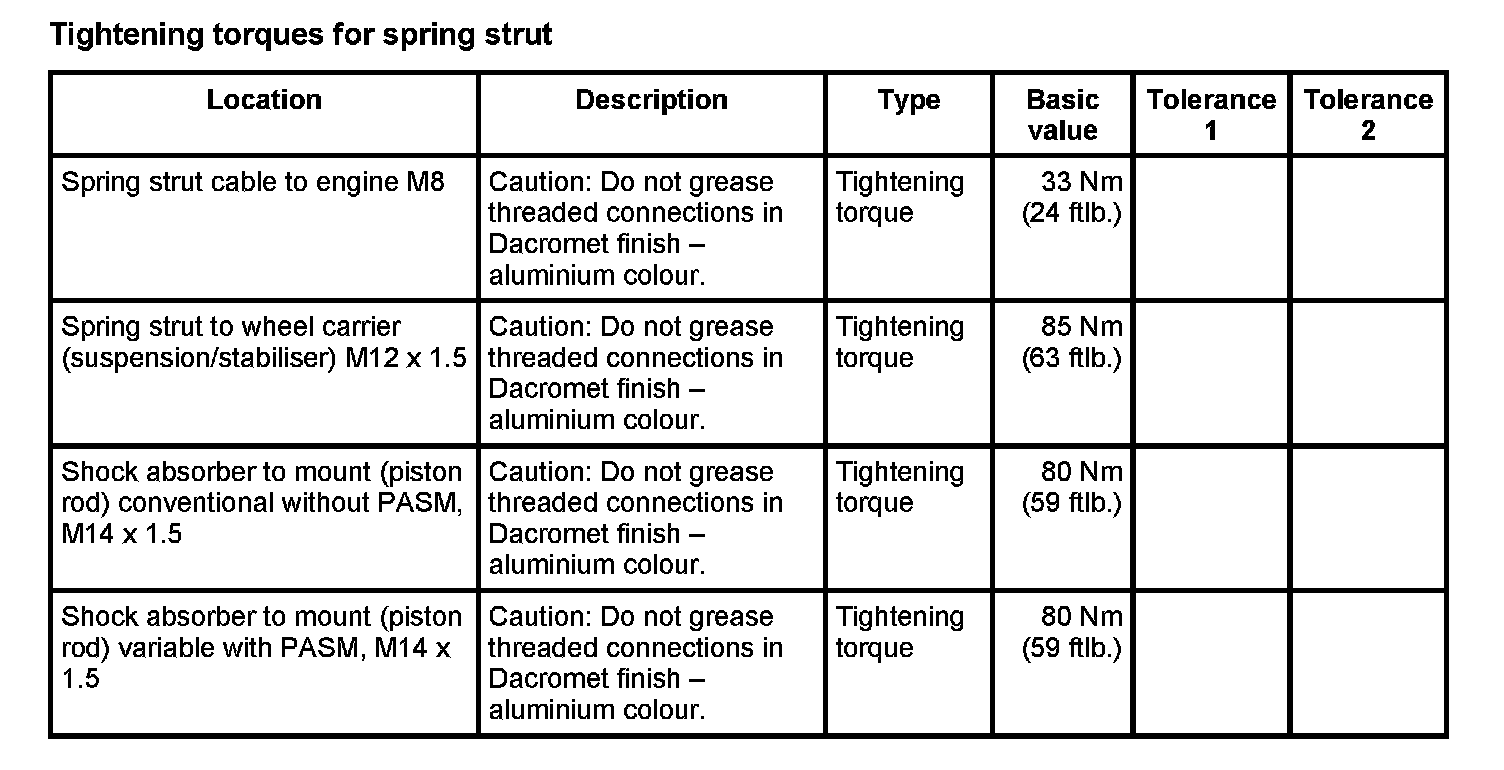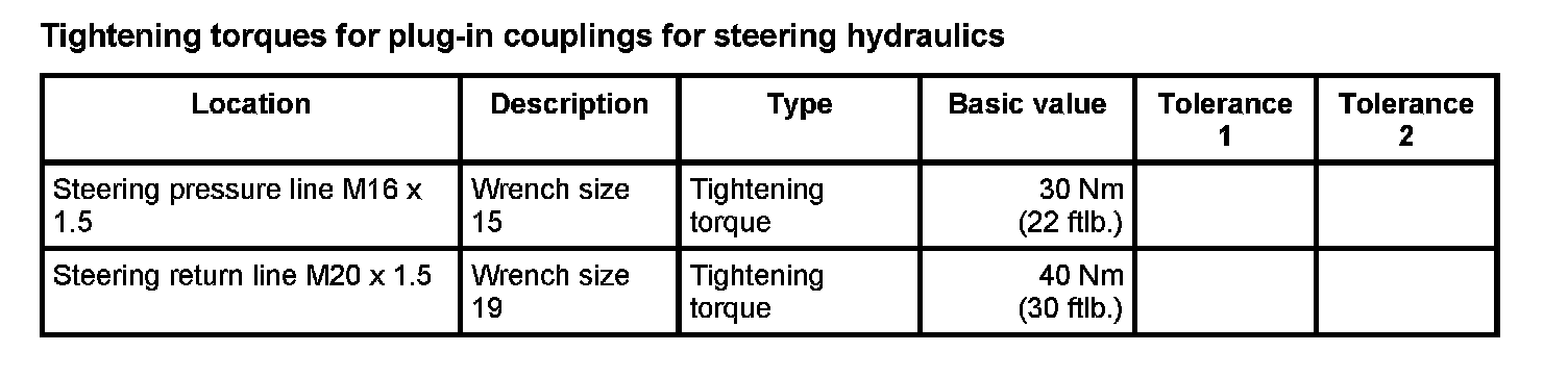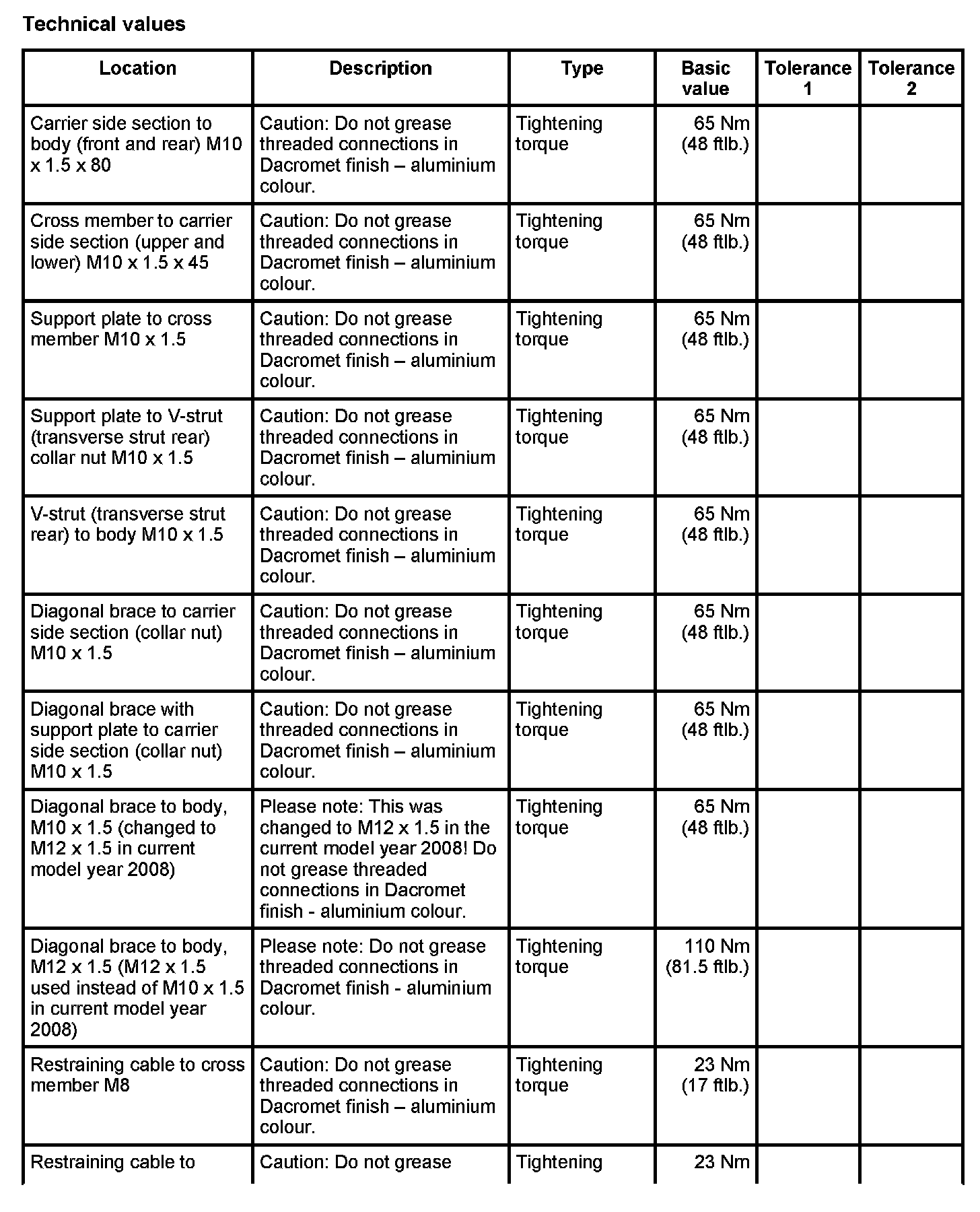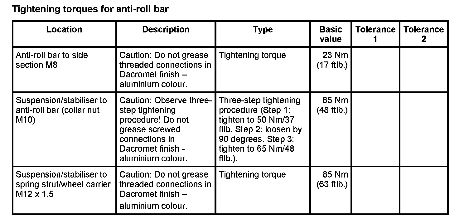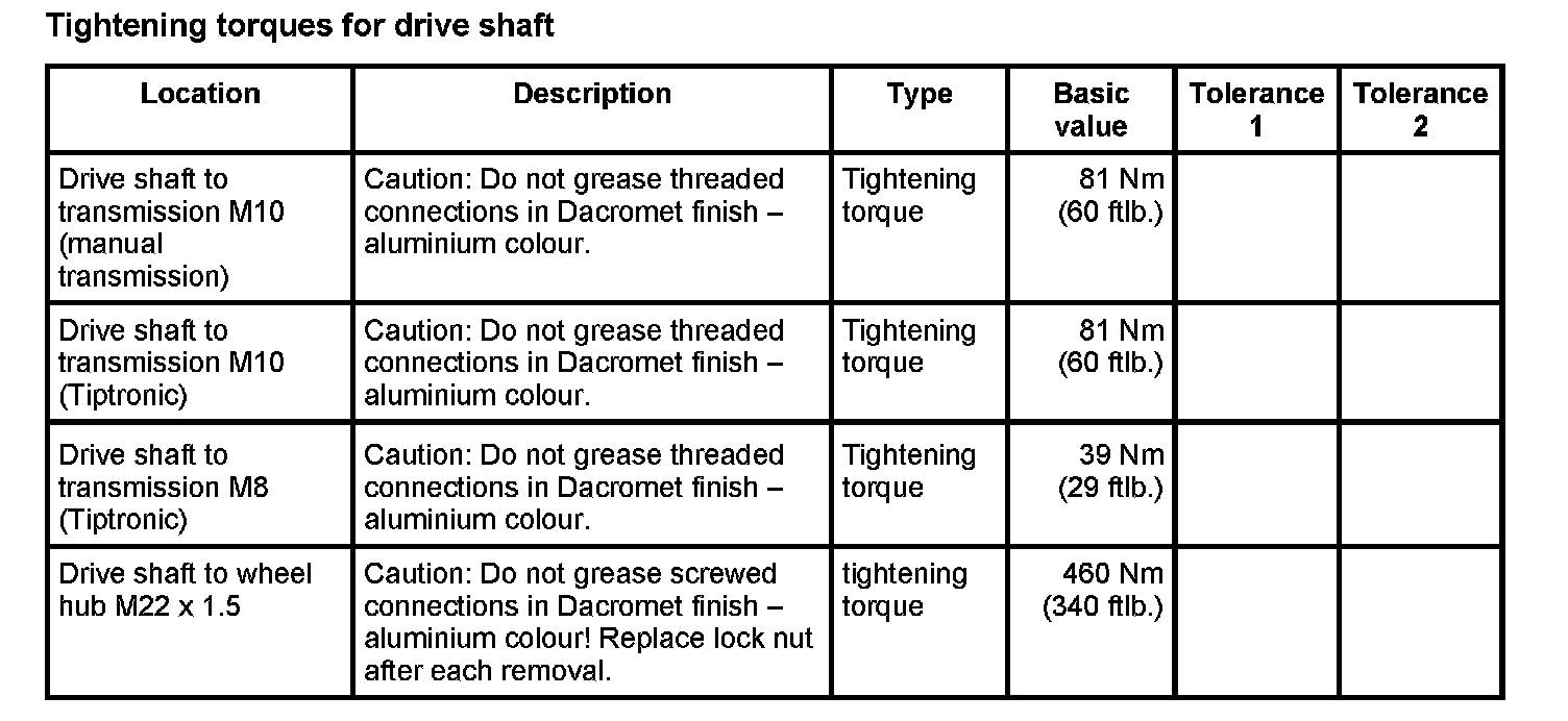 Tightening torques for rear axle