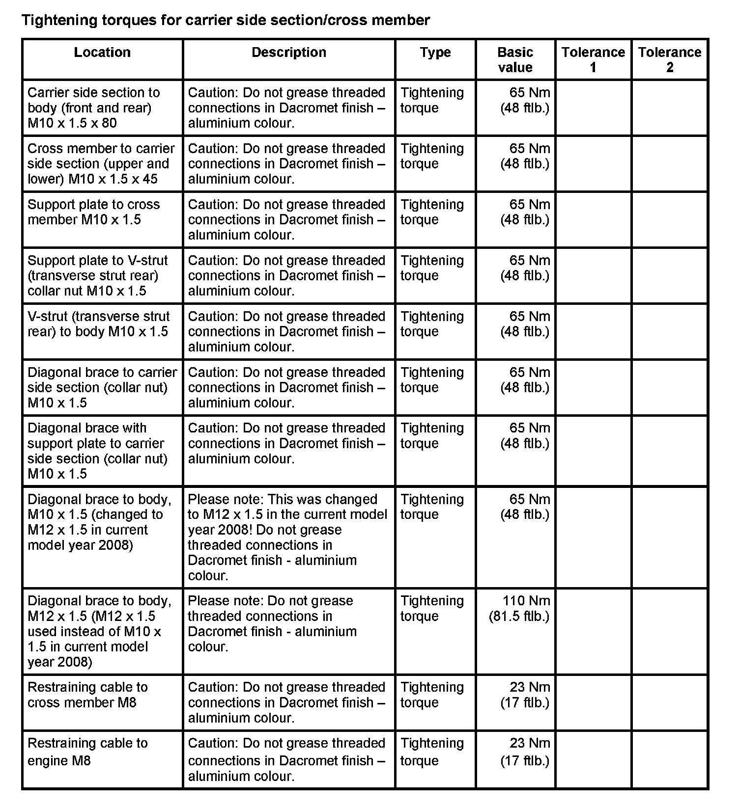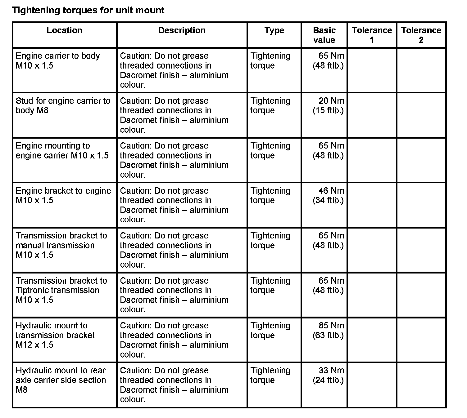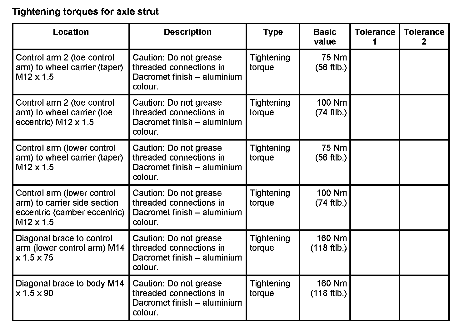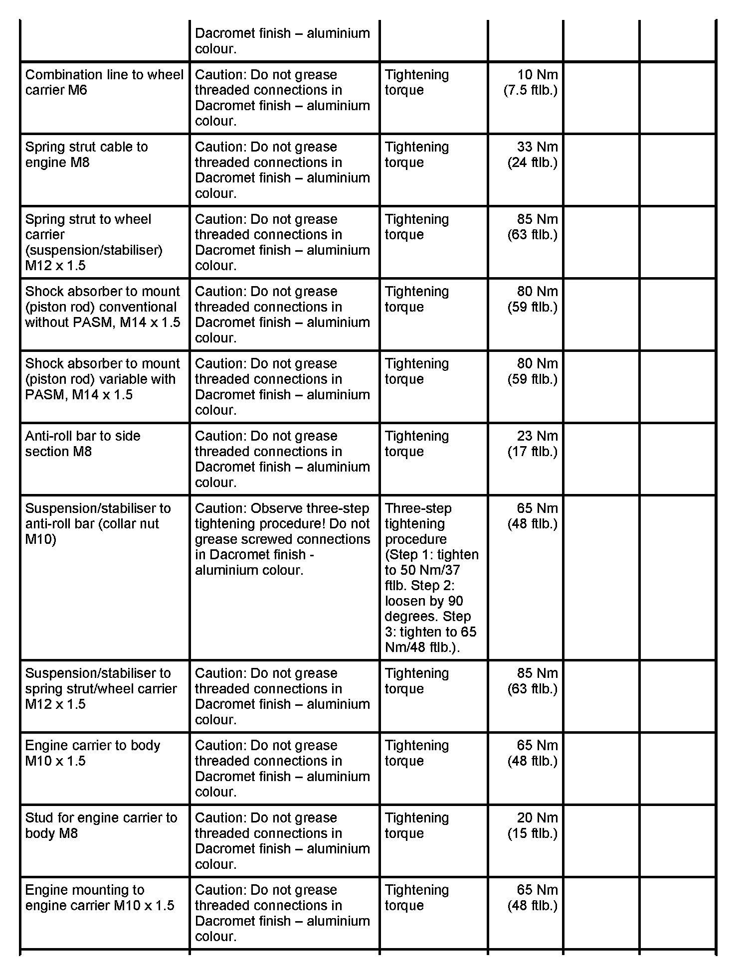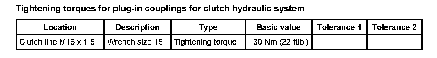 Tightening torques for rear axle
