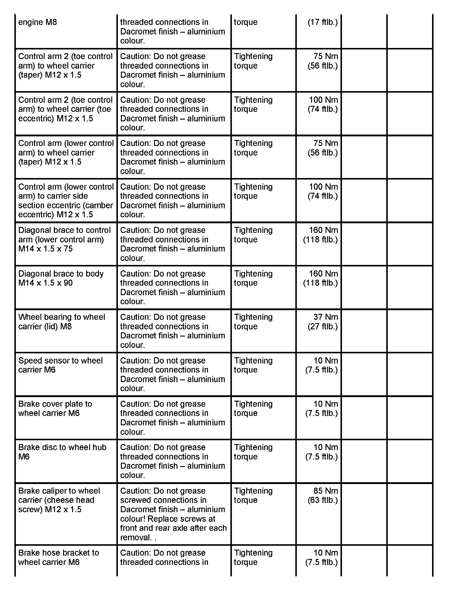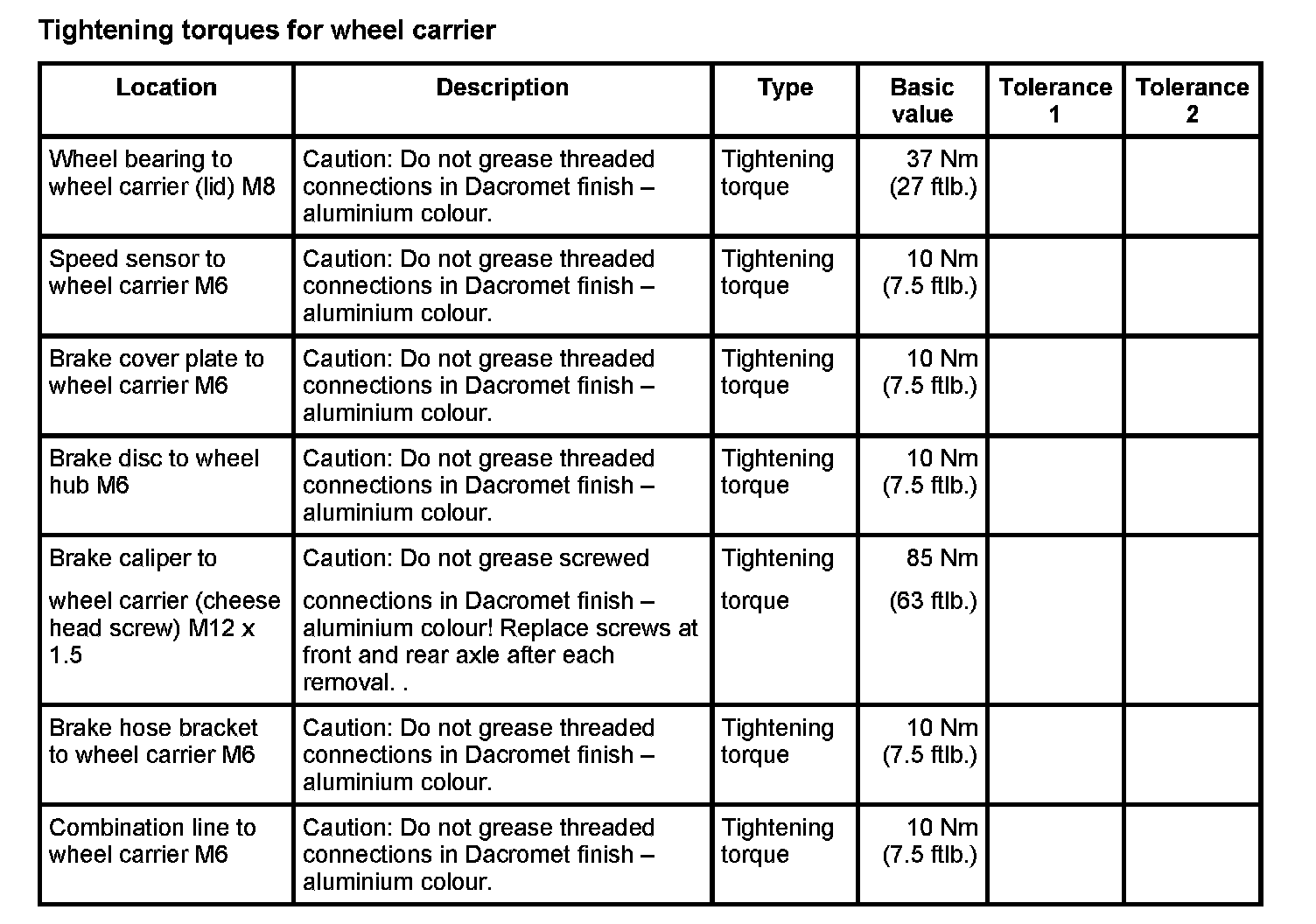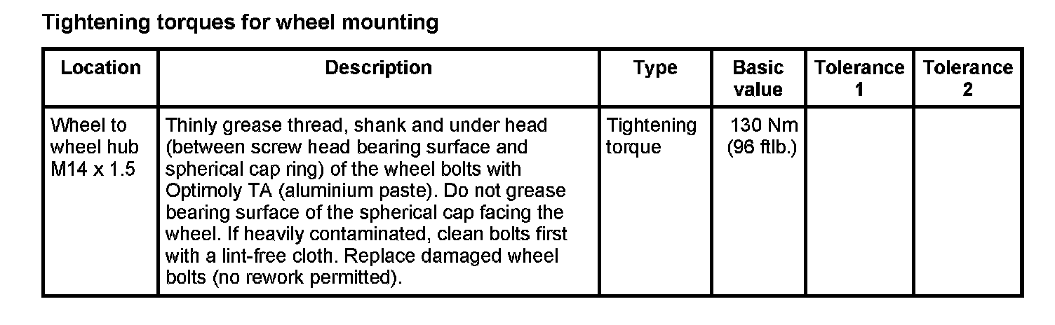 WM 420000 Tightening torques for rear axle