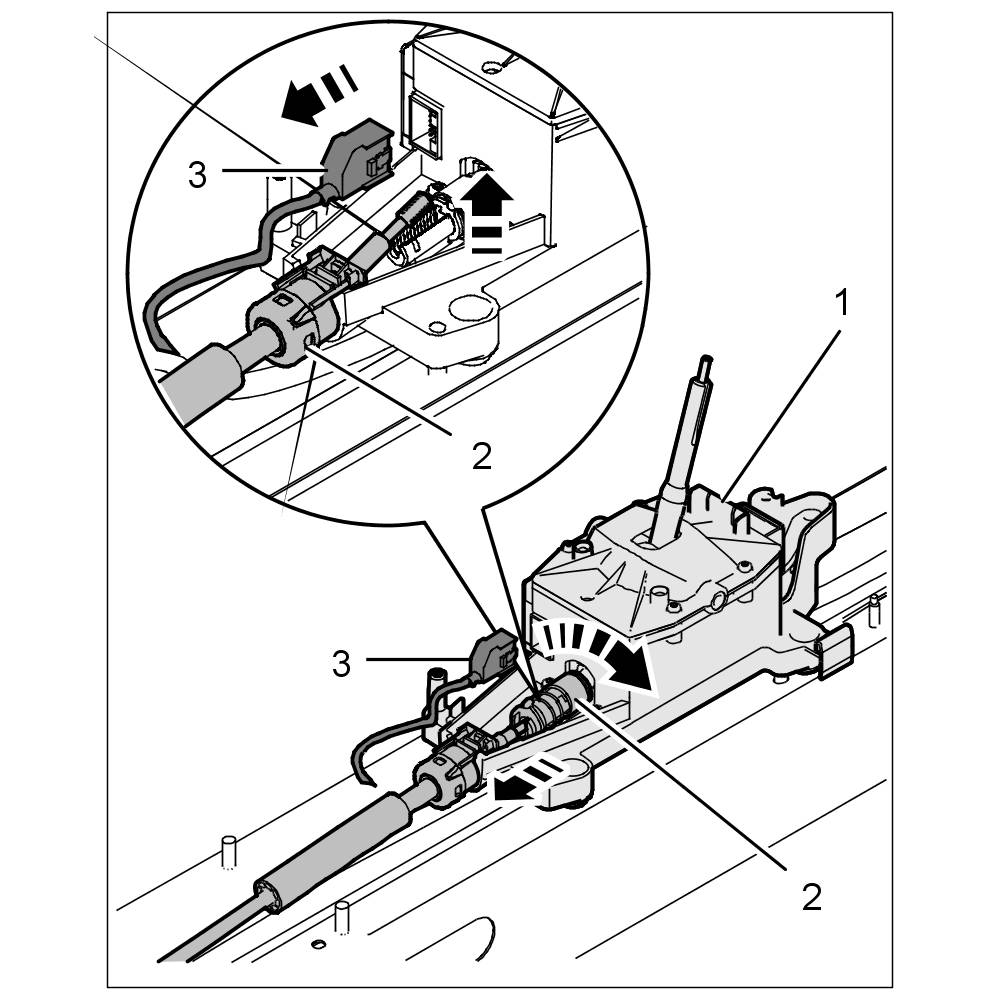Lever off holder -1- at the lock -arrow- and remove parking lock cable -2- and B+ cable -3-.