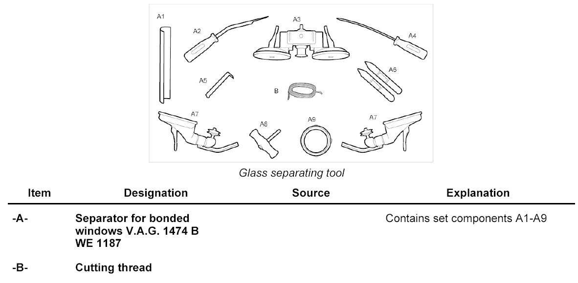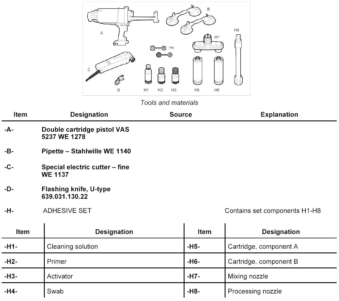 The following tools and materials are required for removing and installing the rear window with 2-component adhesive: