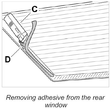 1. Equip cutter -C- with flashing knife -D- and remove remaining adhesive from the rear window, ensuring that a surface coating of adhesive remains.