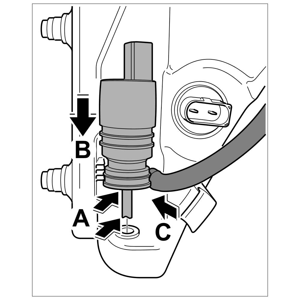 2. Apply a suitable rubber lubricant (tyre mounting paste) to the sealing surface -arrows A- and press the pump for the windscreen washer system into the rubber seal -arrow B- until the pump is felt to engage.